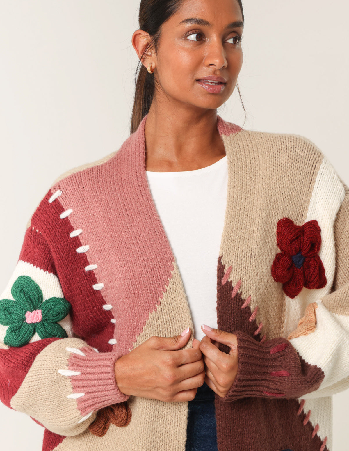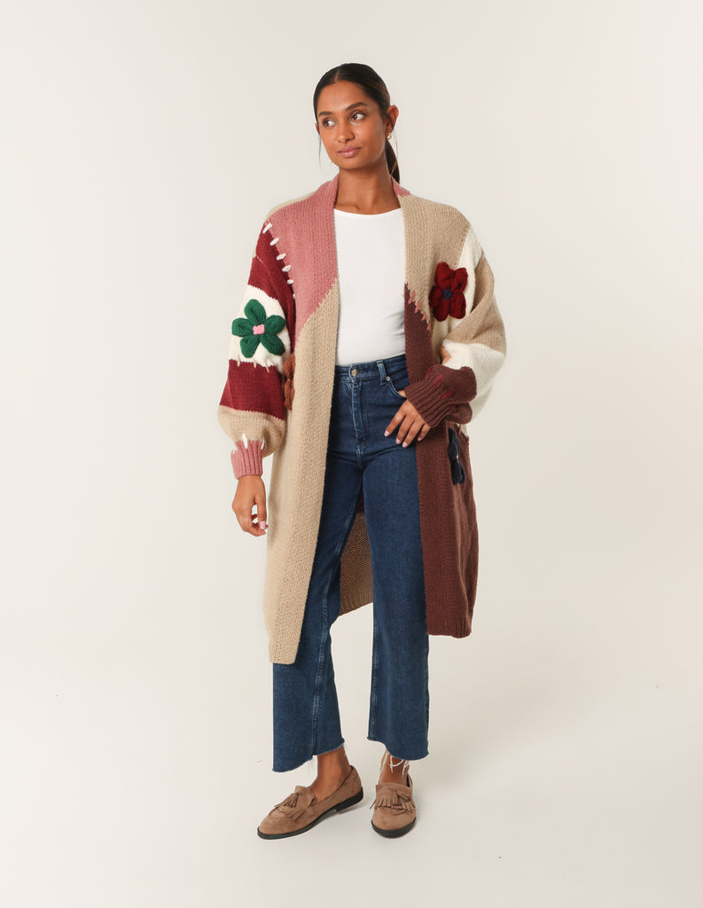 Colour Block 3D Flower Longline Cardigan