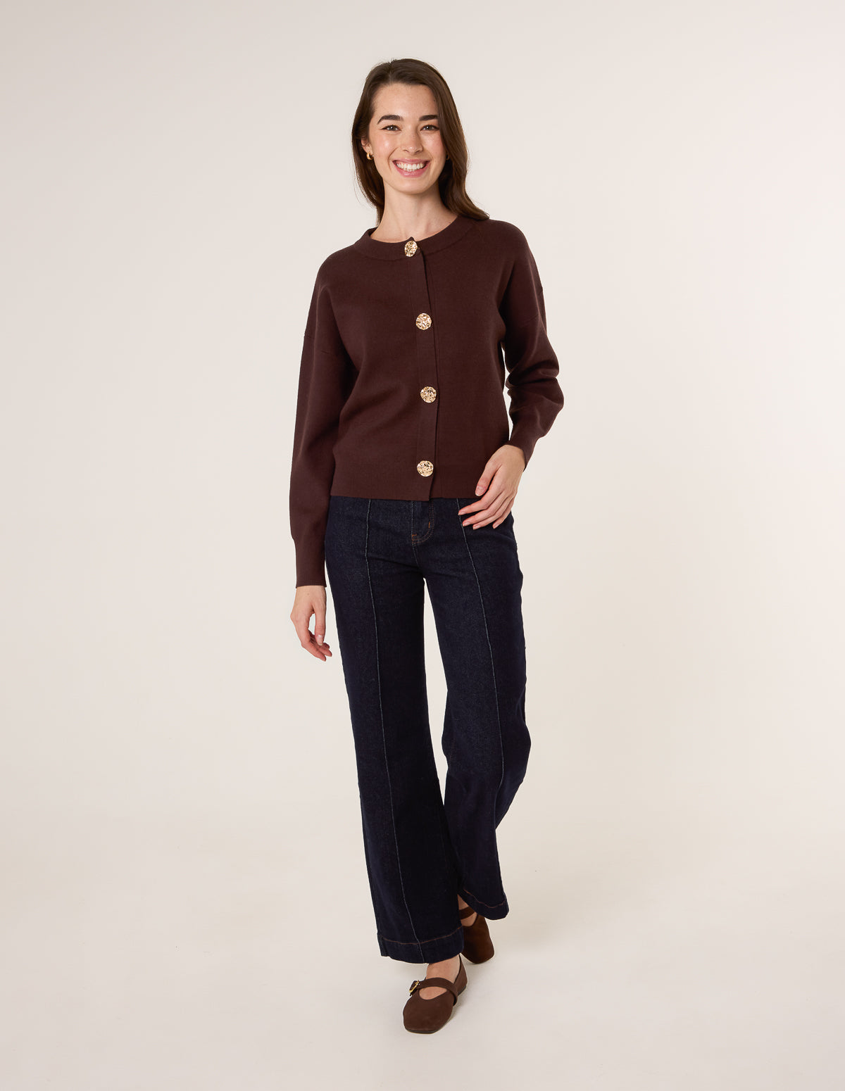 A sophisticated layering piece for the new season. This classic cardigan with large gold buttons adds a twist on your classis, basic cardigan. Team this with just about anything.