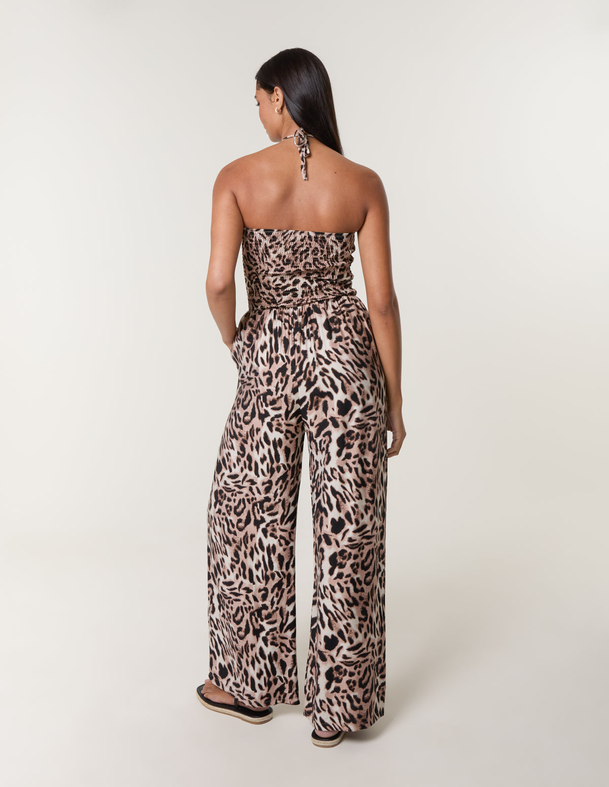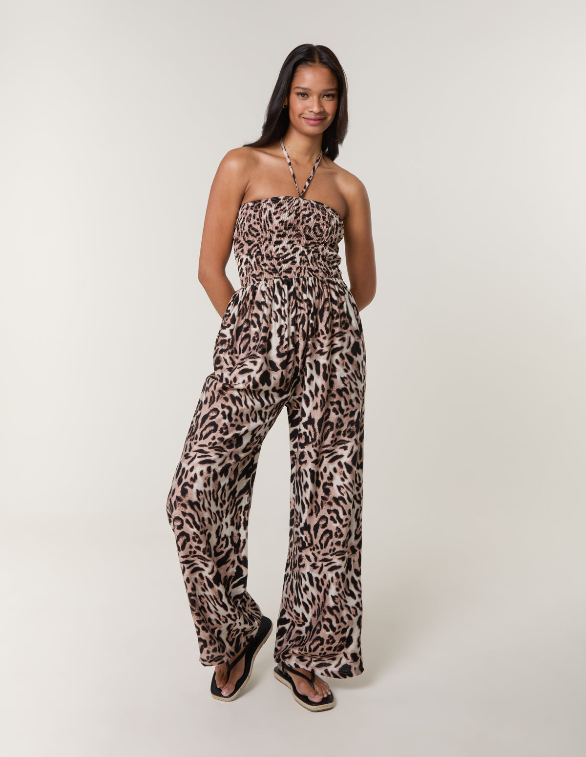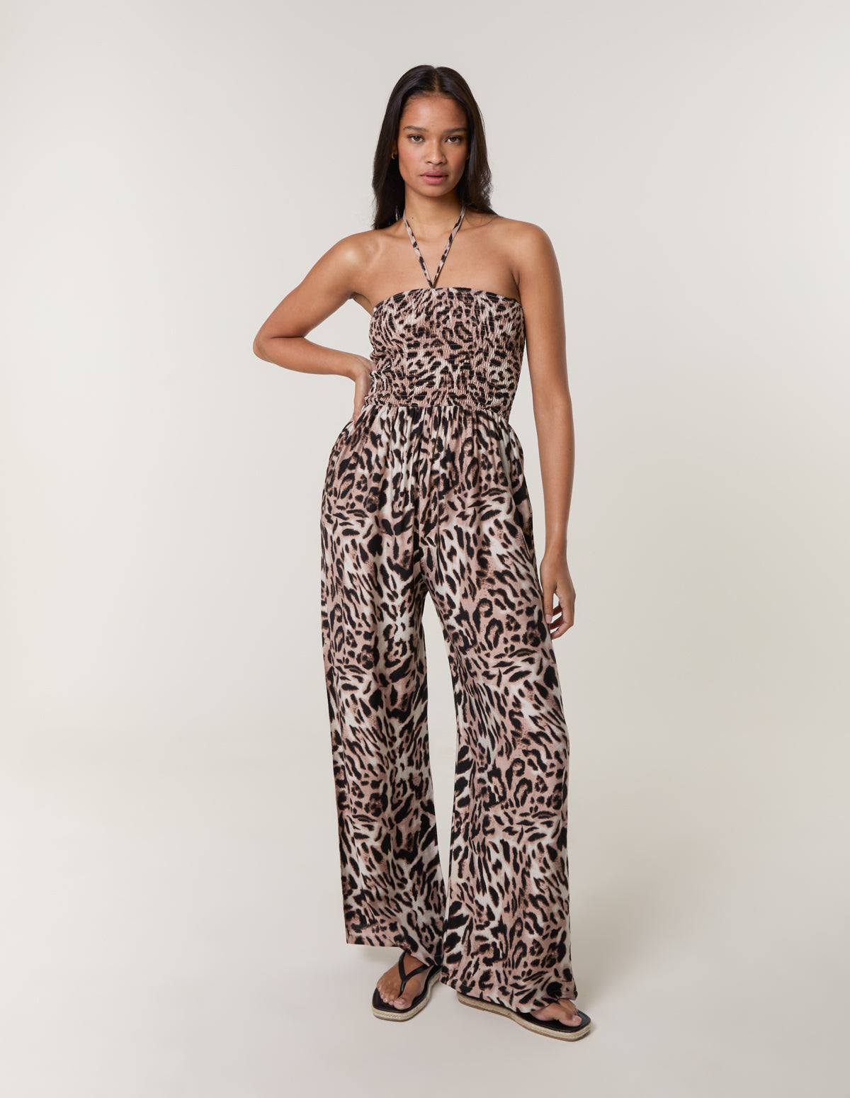 Roar all the compliments in this leopard print shirred jumpsuit. Teamed well with chunky sandals and a woven bag.
