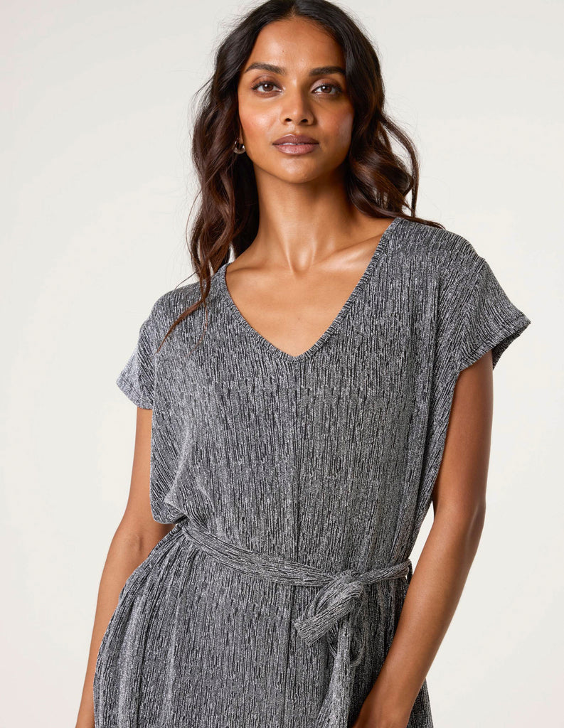 A one sized metallic wide leg jumpsuit that can fit from sizes 8-16, with it's adjustable belt. This option can adjust to fit all kinds of sizes. Teamed with black heels and a swipe of red lipstick ensure to be party ready.