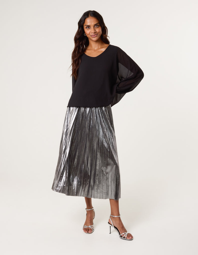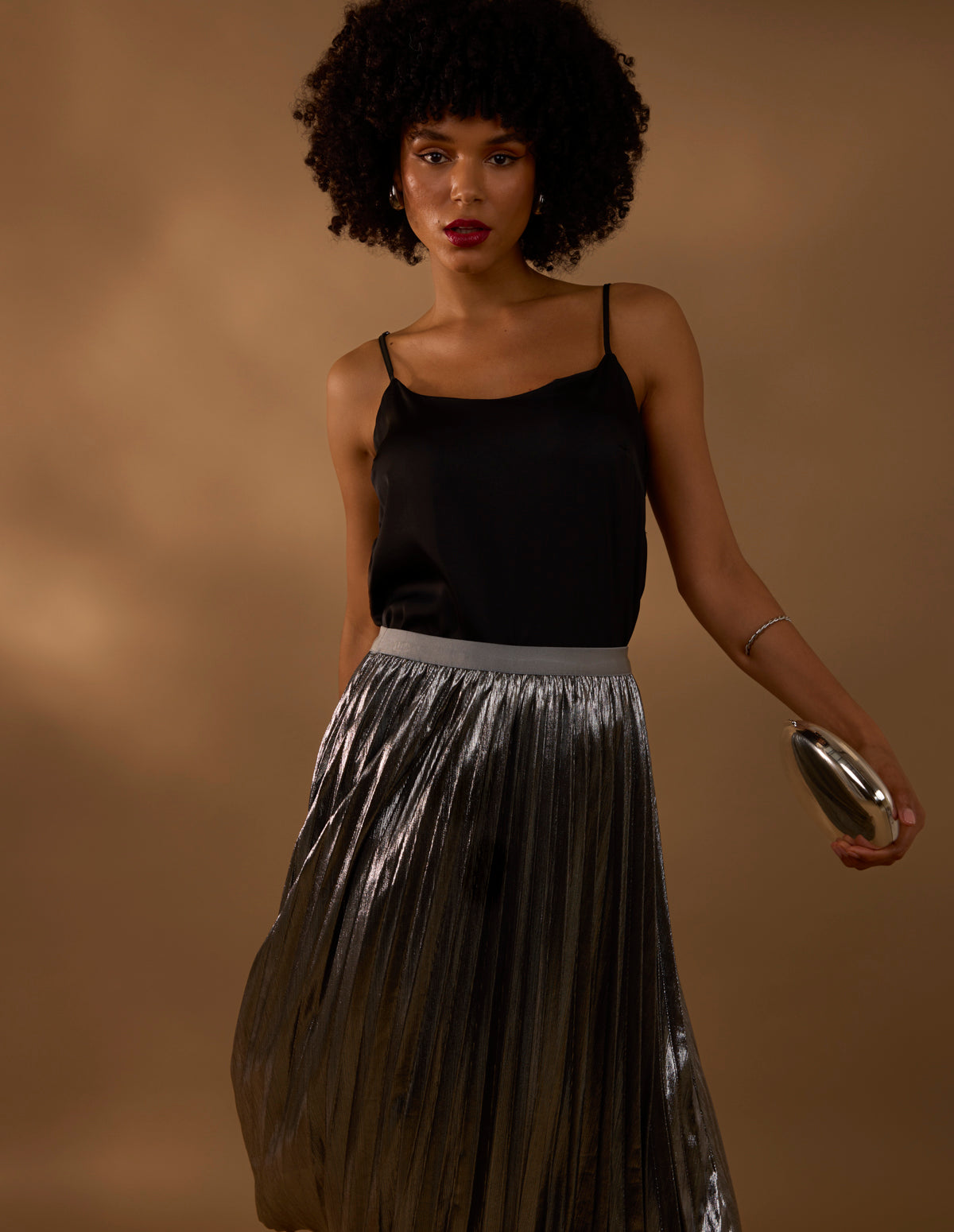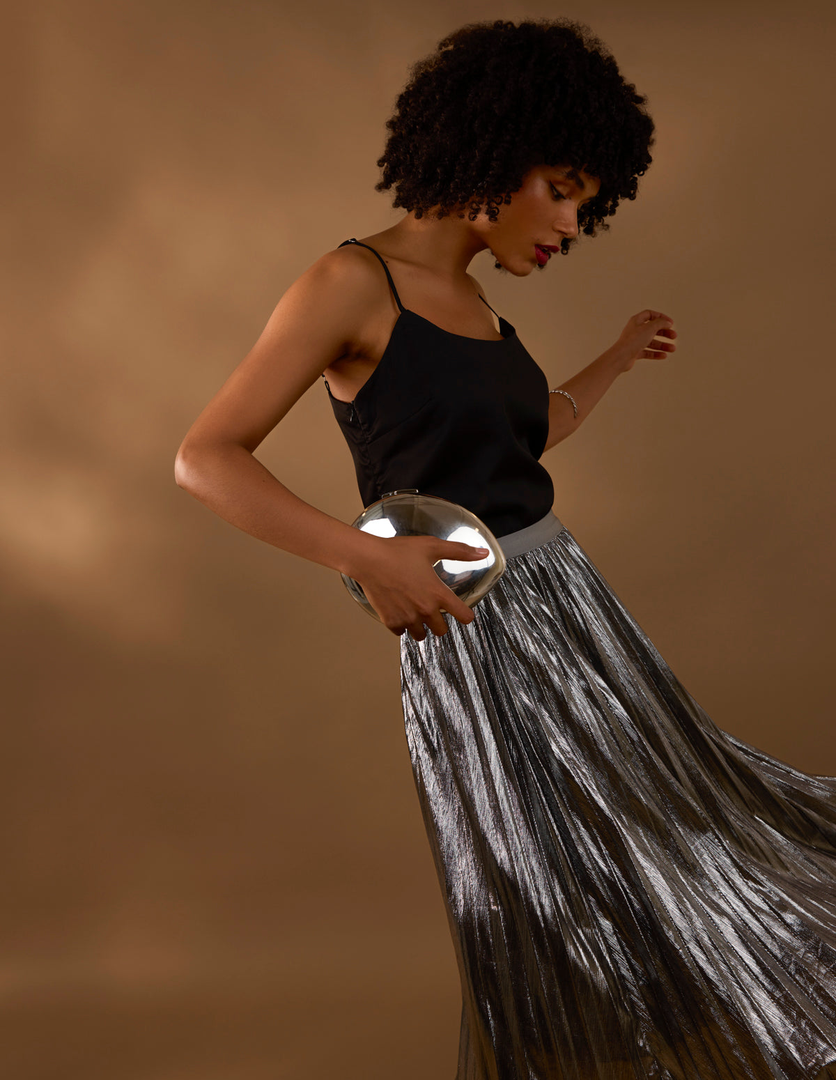 Eye-catching for all the right reason, team this metallic skirt with a slogan oversized top along with a PU jacket and boots, and a swipe of red lipstick for the ultimate chic look.