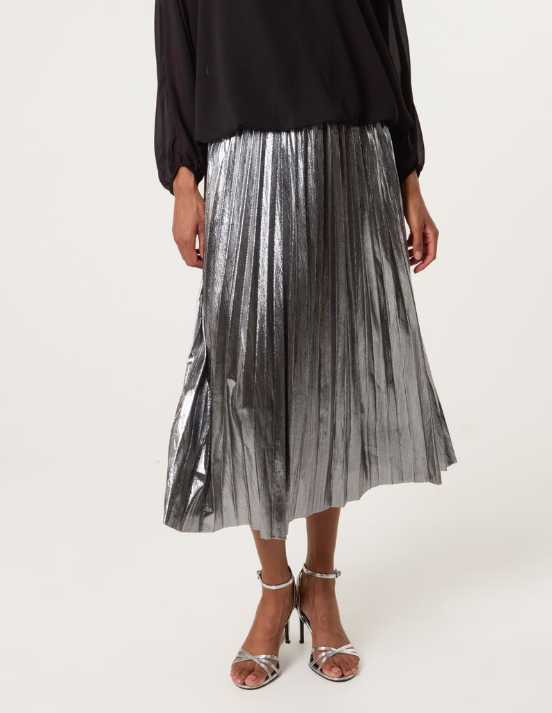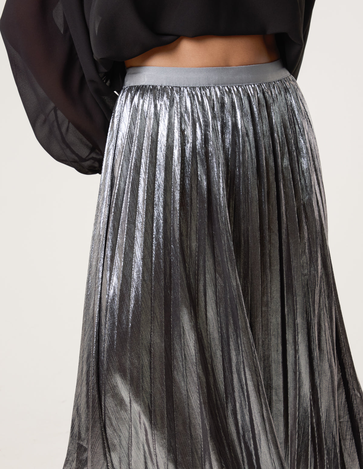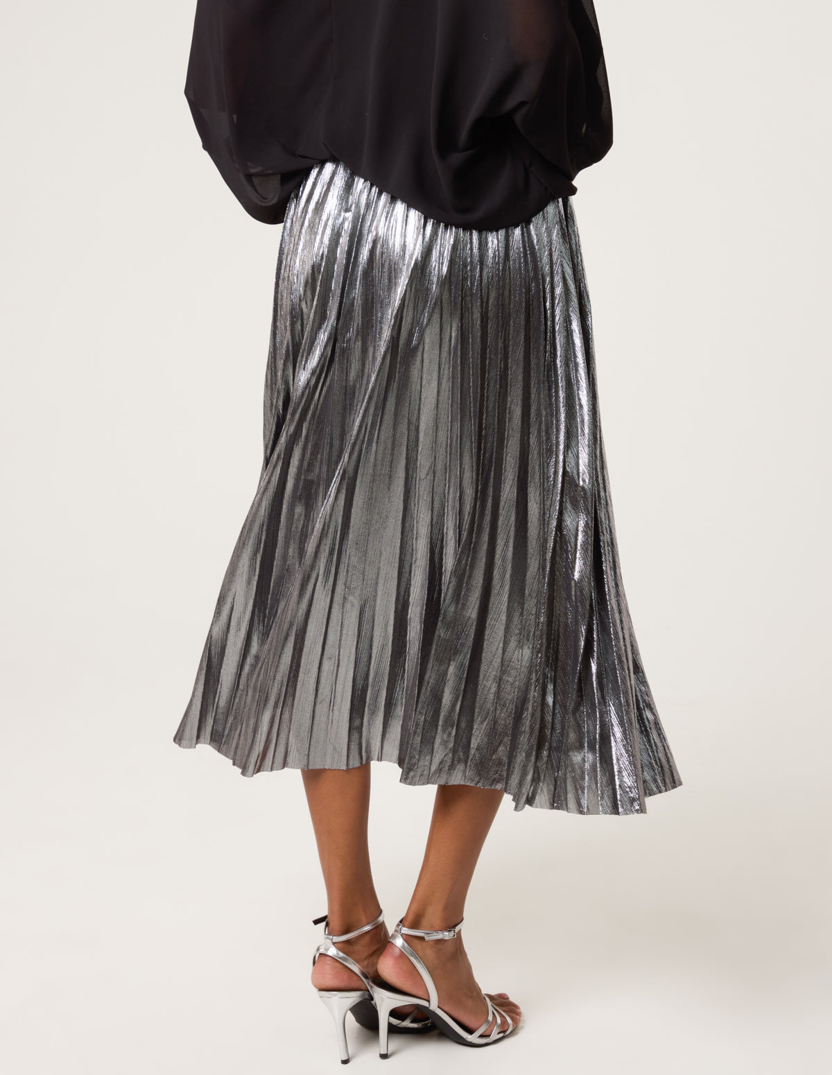 Eye-catching for all the right reason, team this metallic skirt with a slogan oversized top along with a PU jacket and boots, and a swipe of red lipstick for the ultimate chic look.
