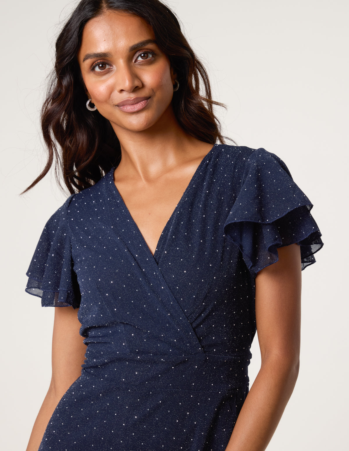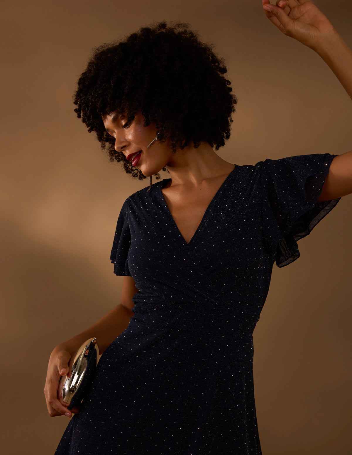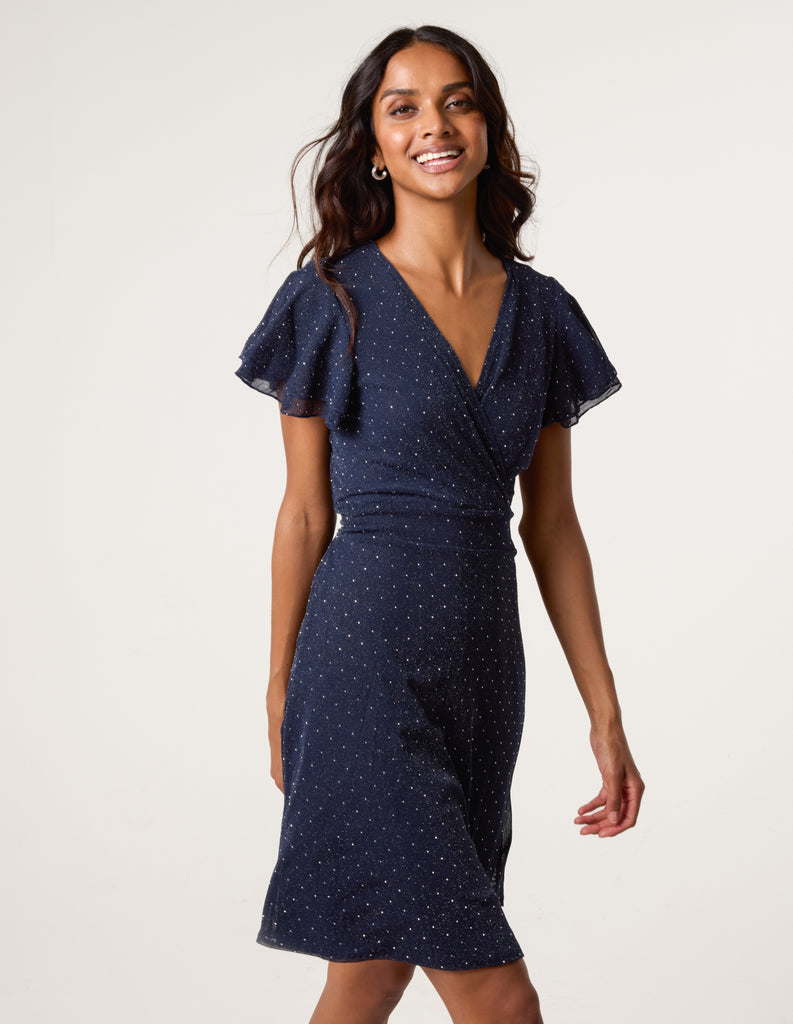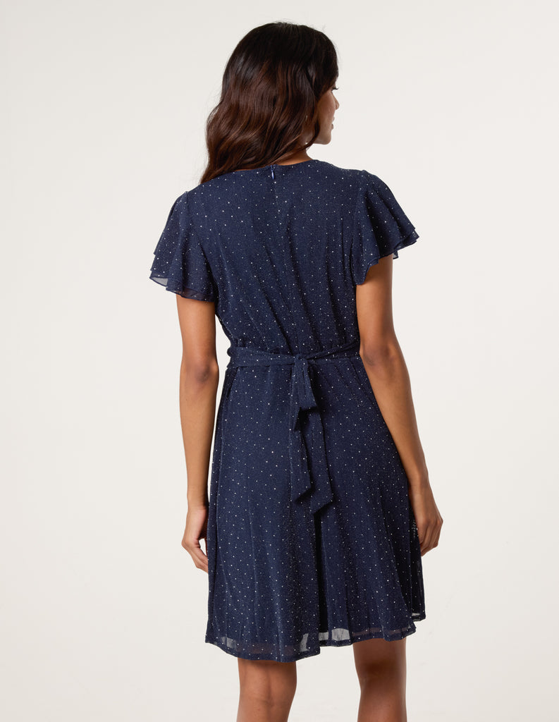Eye-catching for all the right reasons, team this stud detailed wrap front dress with sheer tights and silver court heels for the ultimate partywear look.