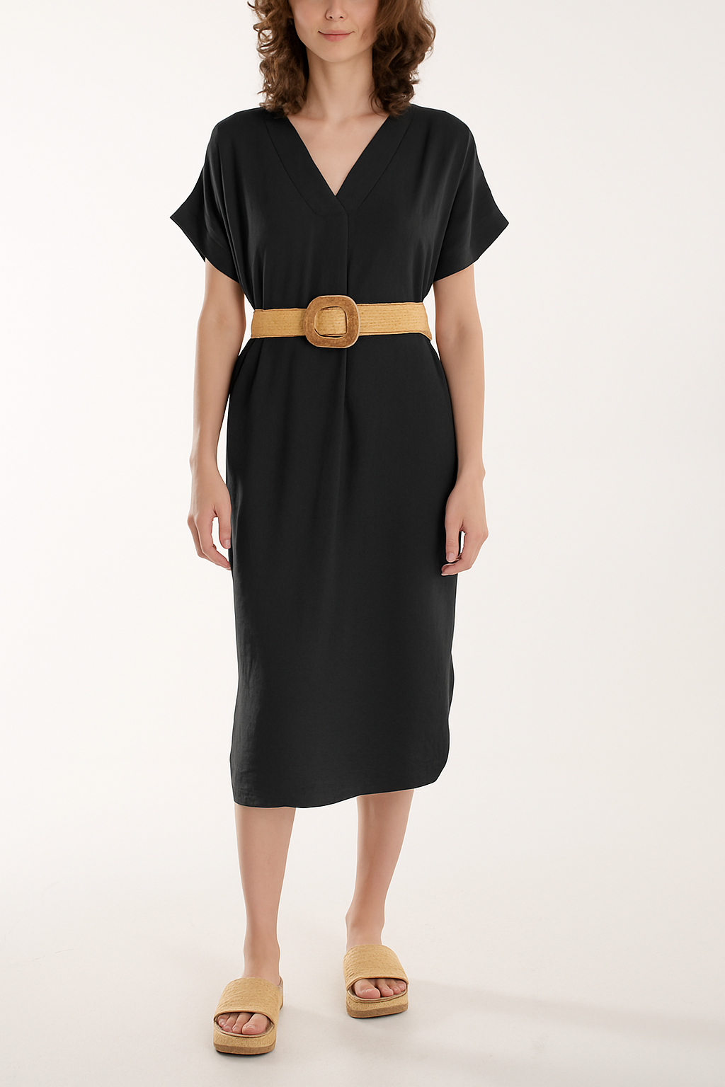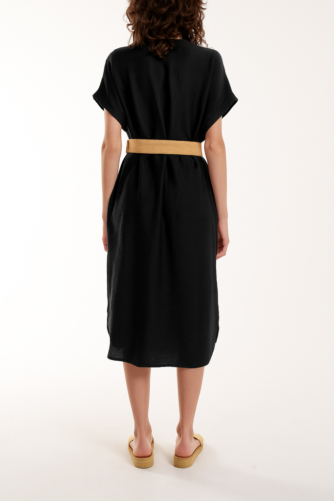 Bellted V-Neck Short Sleeve Midi Dress