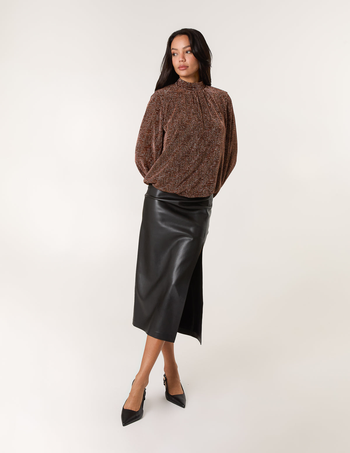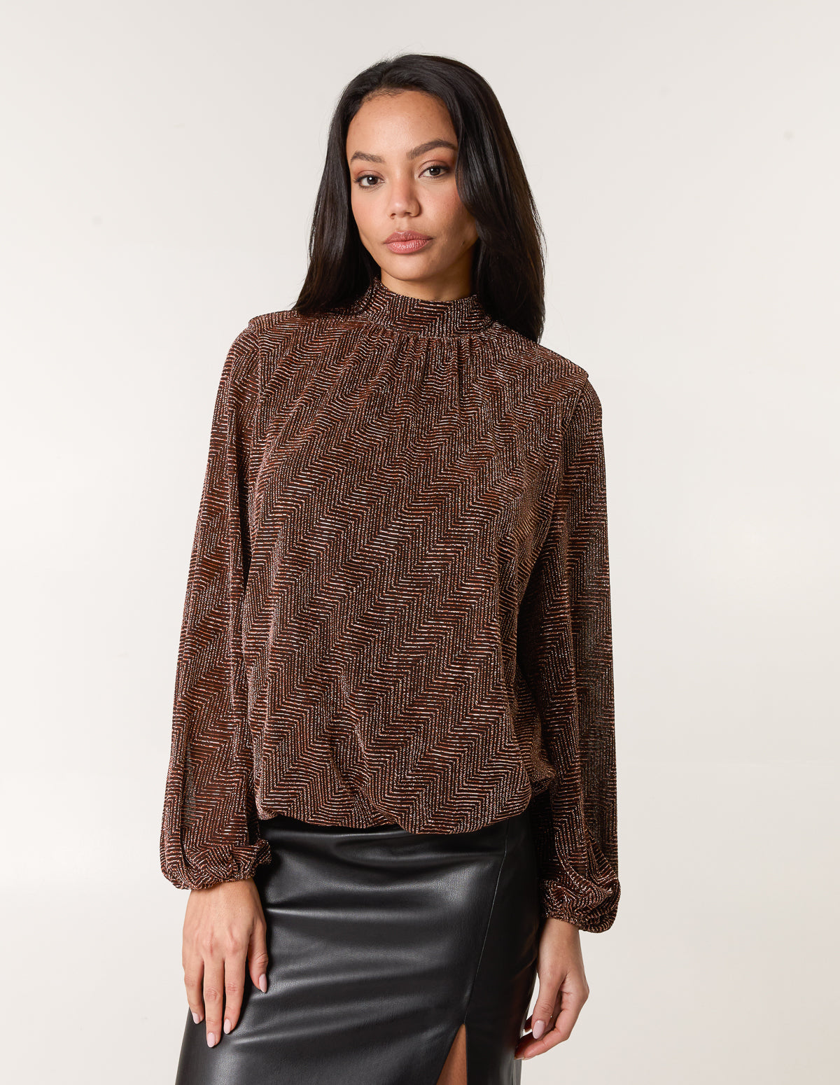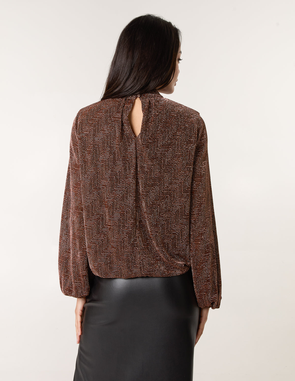 Embrace effortless style wearing this lurex puffball blouse. Team with a leather looking skirt and sheer tights for an outfit that will take you from dinner to drinks fuss free.
