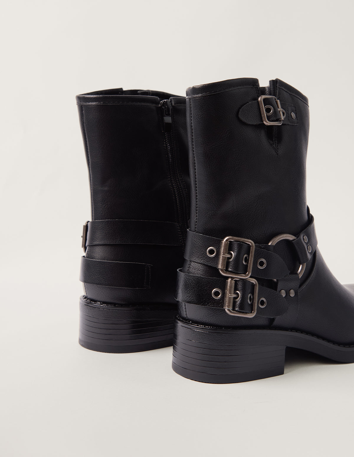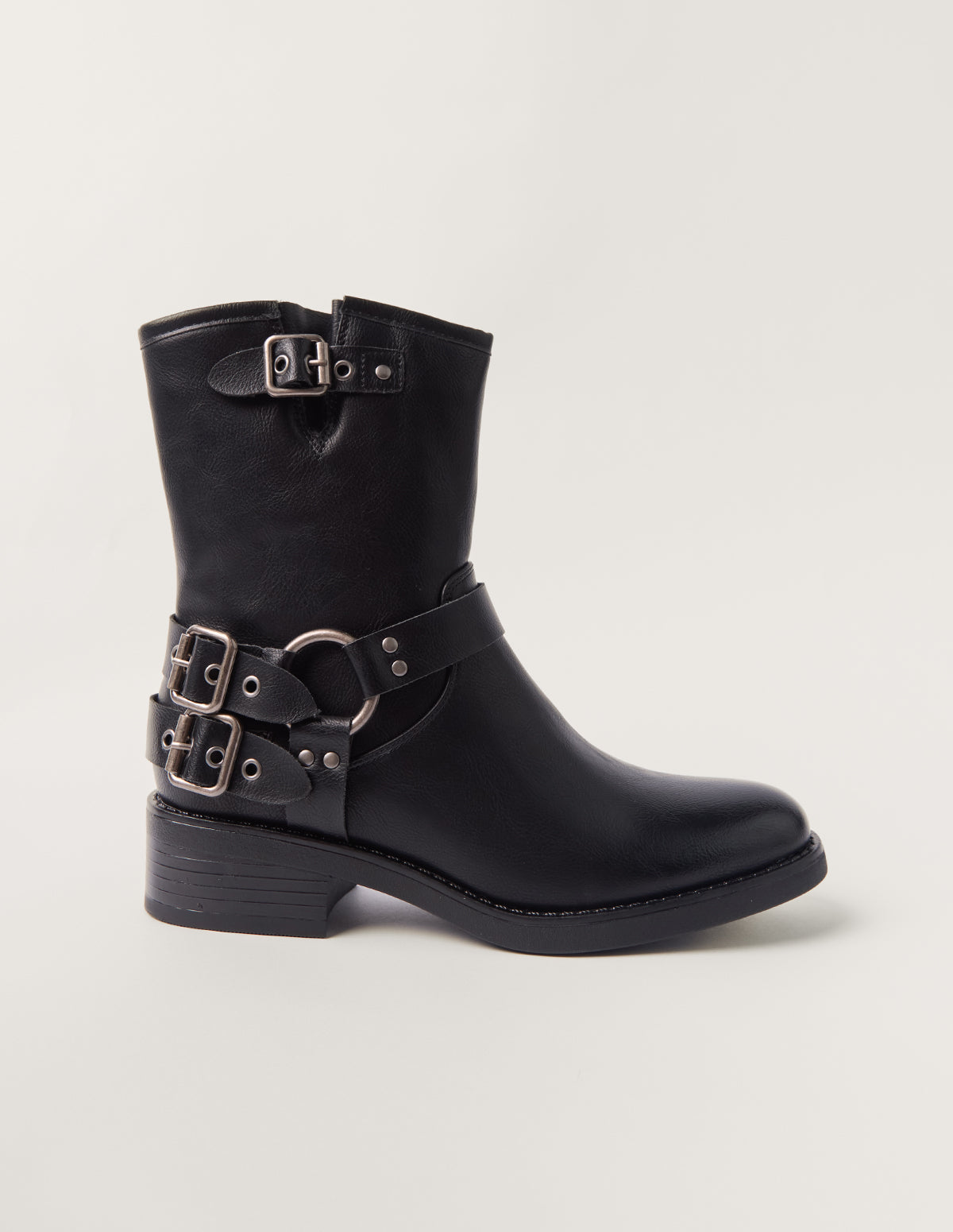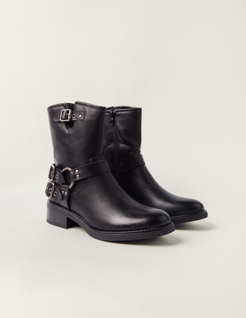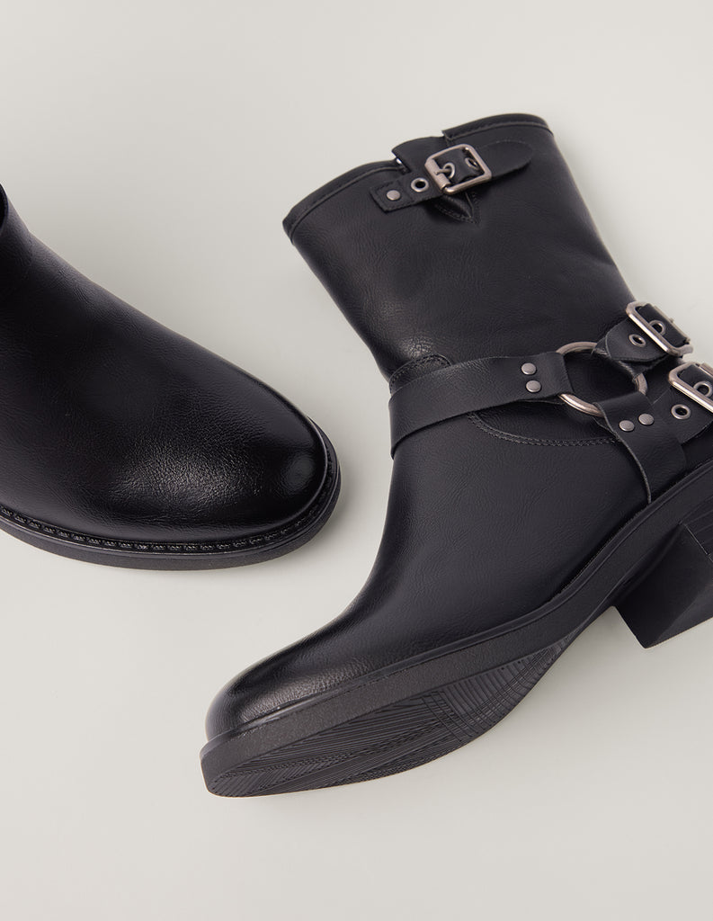 A chunky style for the cooler weather ahead, these leather-look biker boots with multiple buckles are comfy and hard wearing.