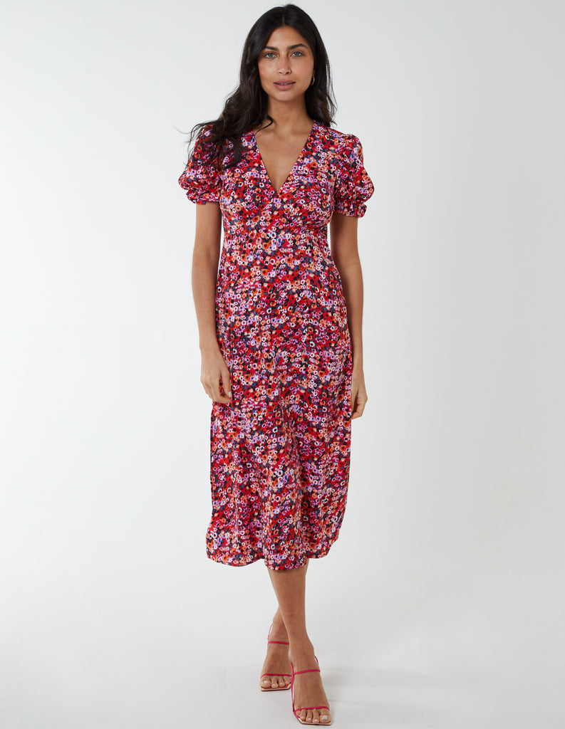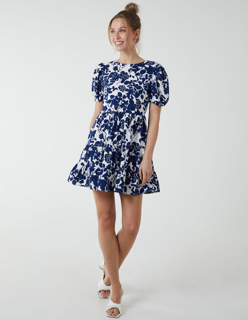 Printed Long Cuff Sleeve Shirred Waist Dress
