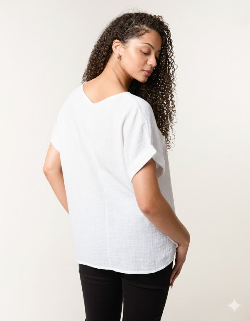 Embrace those warm-weather days in a light airy top. Team with chinos and pumps.