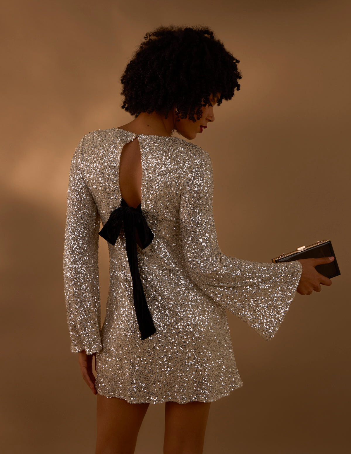 Sparkle your way into the party season wearing this gorgeously detailed dress! With flare sleeves, and a velvet bow back. Team this Gold heels, and accessories to create the perfect formal look this party season!
