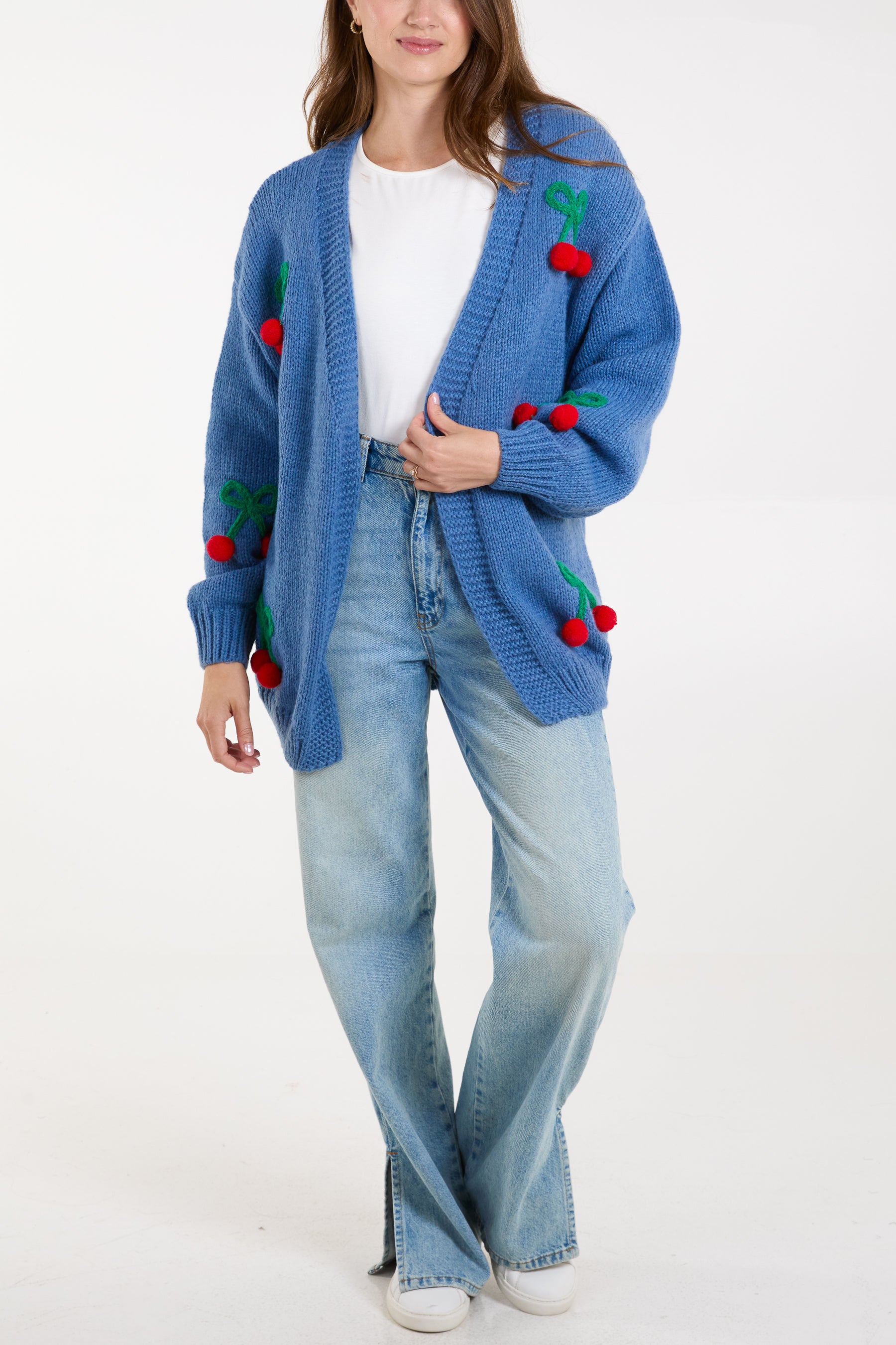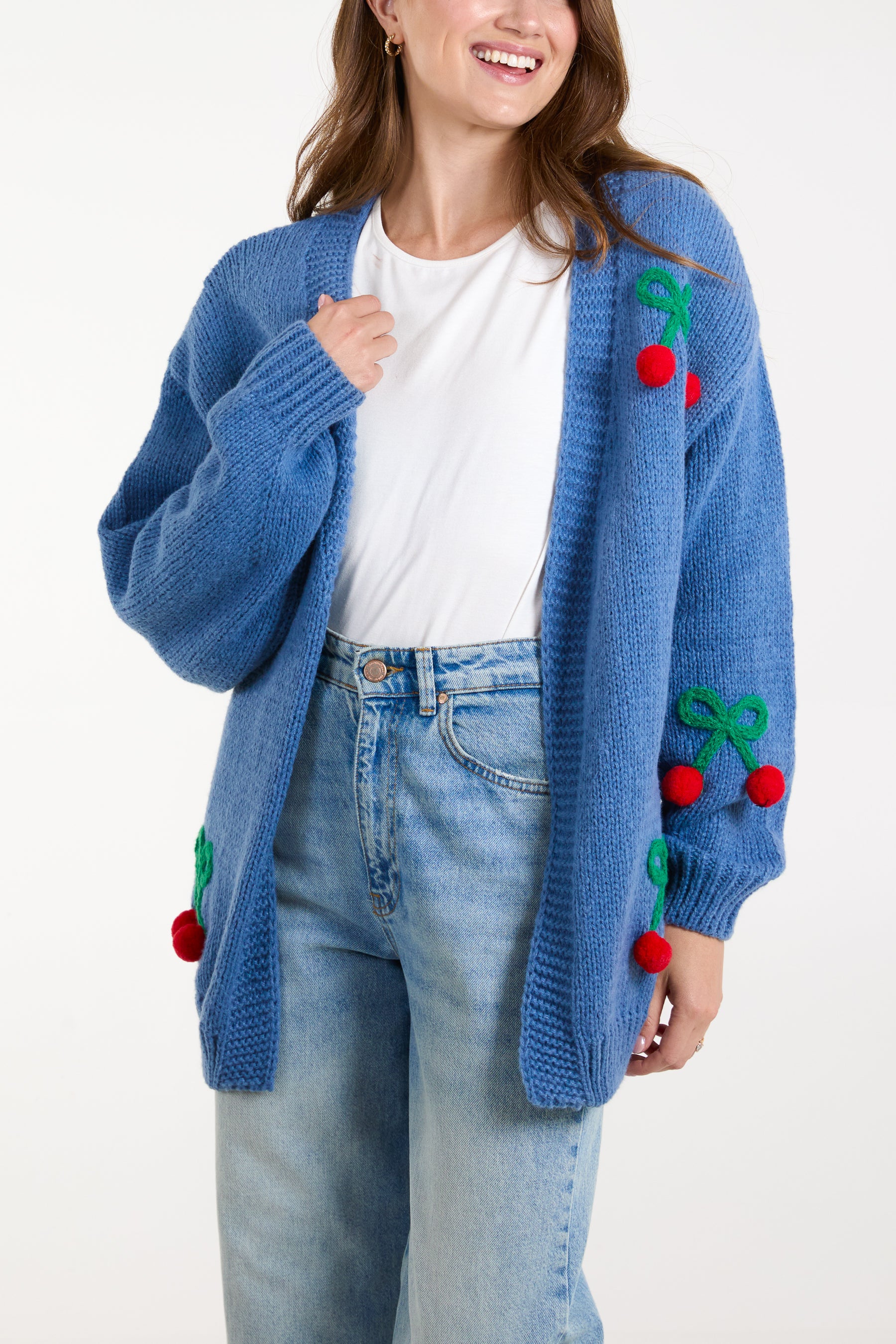 A cute cardigan to snuggle into when the weather gets chilly. This cherry detailed flower cardigan is the perfect layering piece for you.