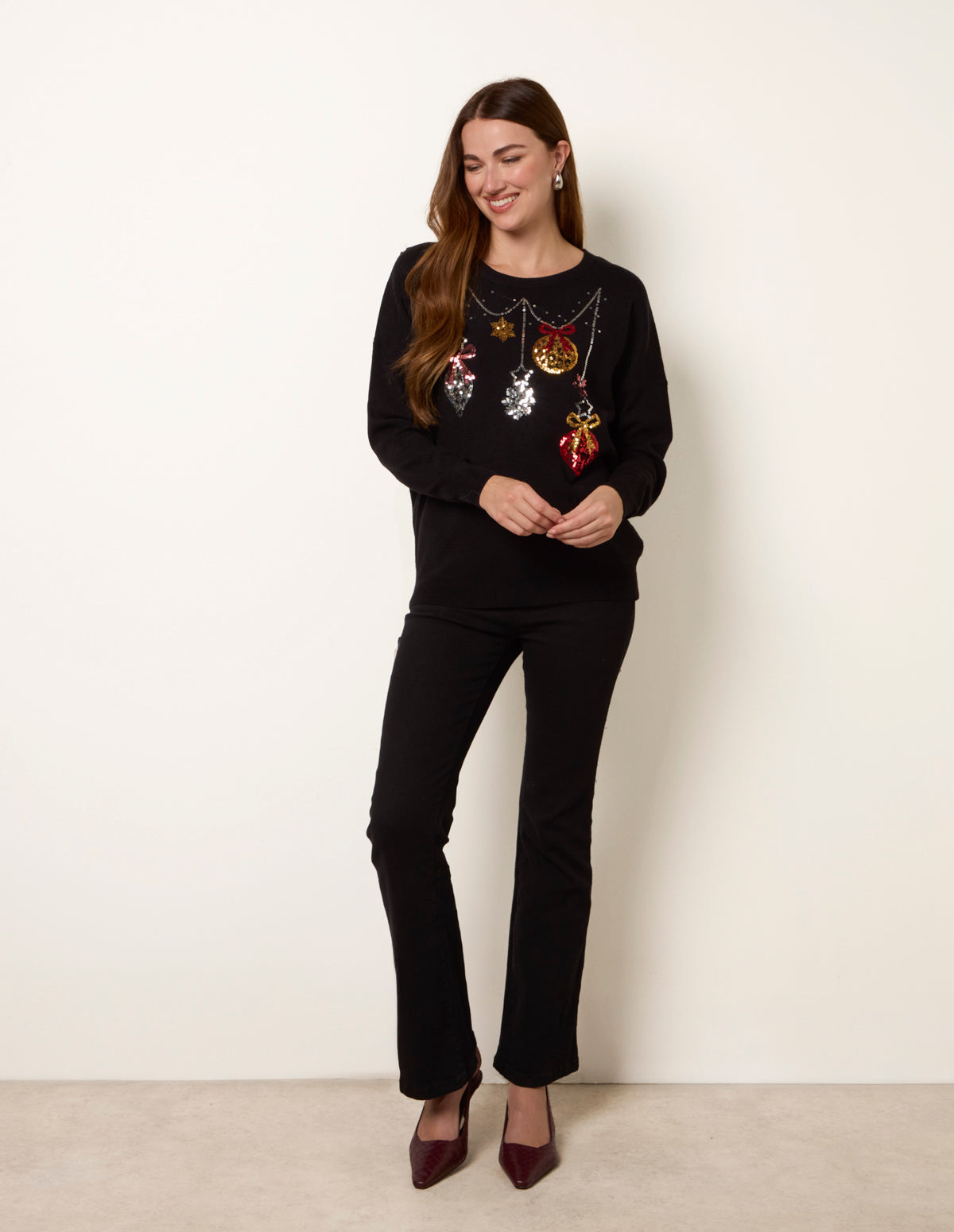 Get in the festive spirit and shop this chic Christmas jumper! Grab your girlfriends and sparkle this festive season to keep all eyes on you. Pair with loose jeans and slippers for a Christmas day outfit to remember.