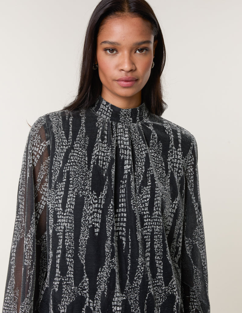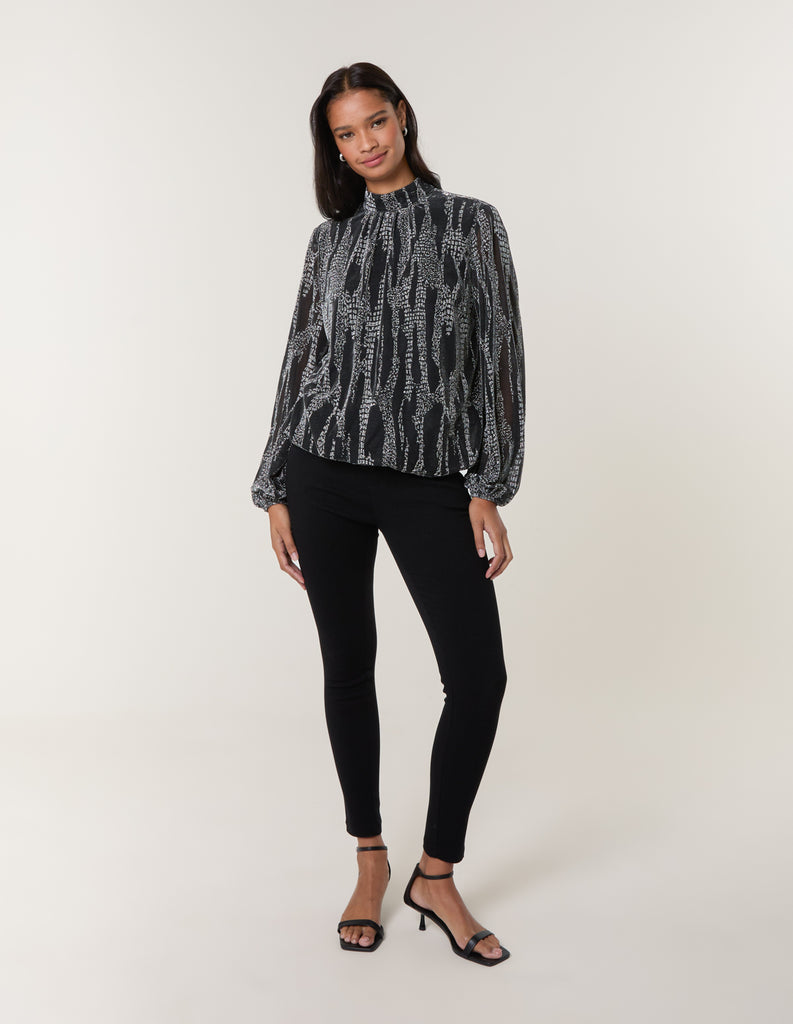 The perfect blouse to wear this party season! Team this metallic snake print blouse with leather look trousers and silver court heels. Feel comfortable and look nothing but glam!
