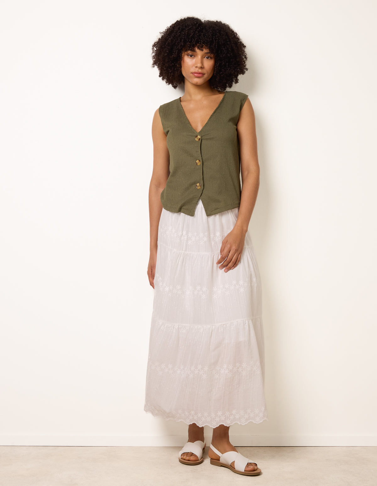 The maxi skirt every summer wardrobe needs! This flowy white maxi skirt is highlighted by crochet detailing trims. It sits comfortably with an elasticated waistband.