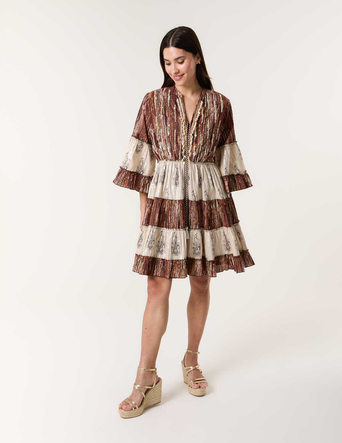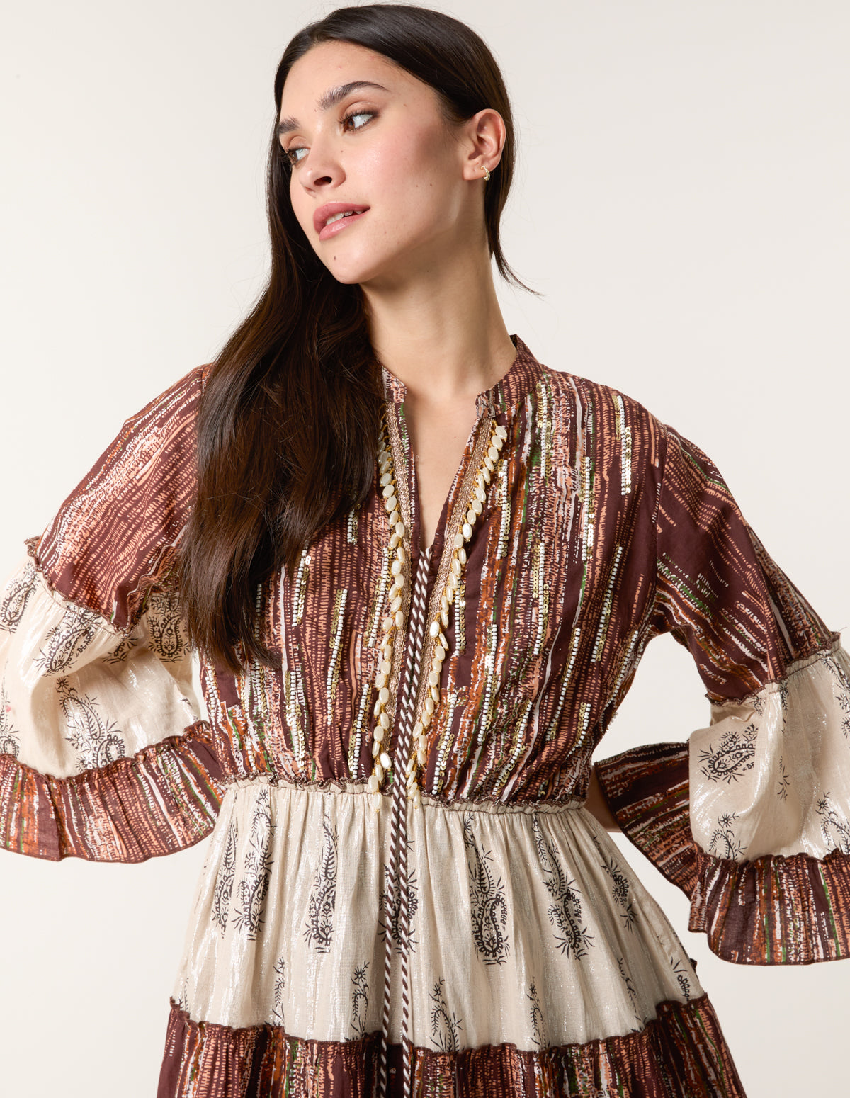 A dreamy holiday dress, perfect for those warm sunset nights. With it's beautiful shell and sequin details, team this holiday number with gold accessories and sandals to help finish off your look.
