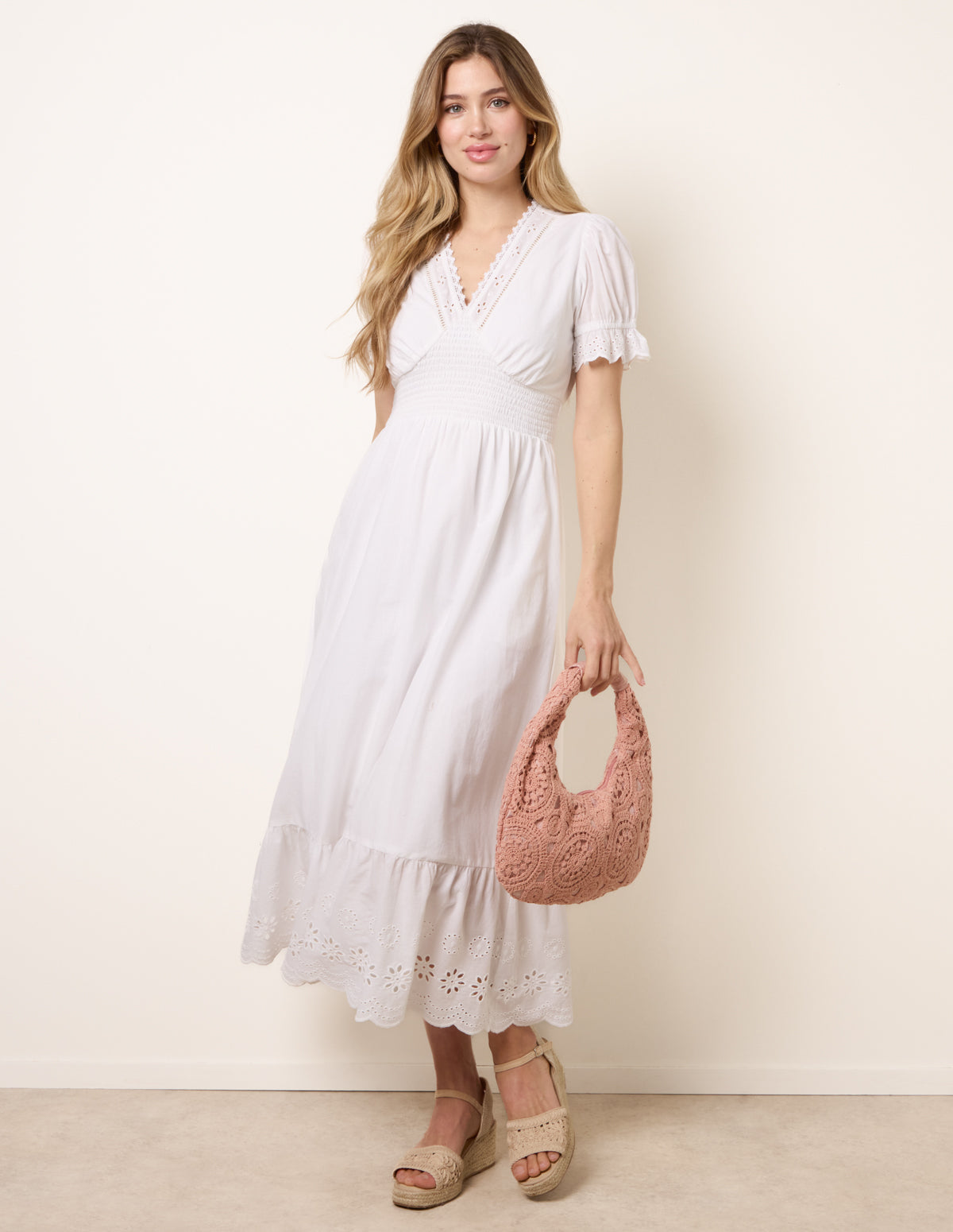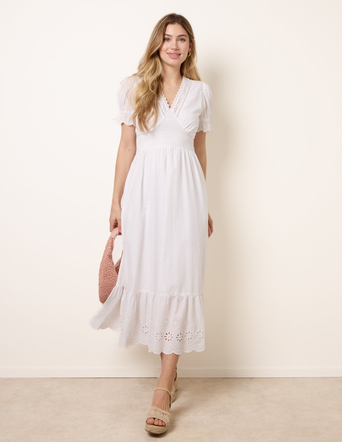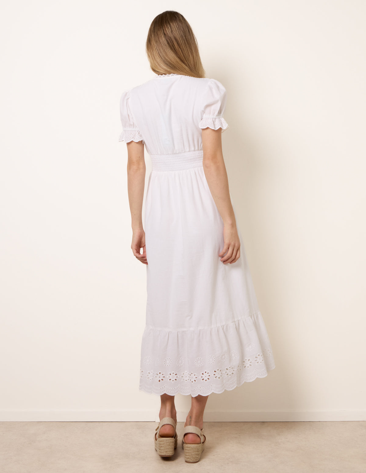 This elegant dress combines carefree charm with thoughtful details, making it a perfect addition to your warm-weather wardrobe. The embroidered panels and ruffle create a beautifully balanced look, perfect for all occasions this season. Team with gold sandals and gold accessories to finish off the look.