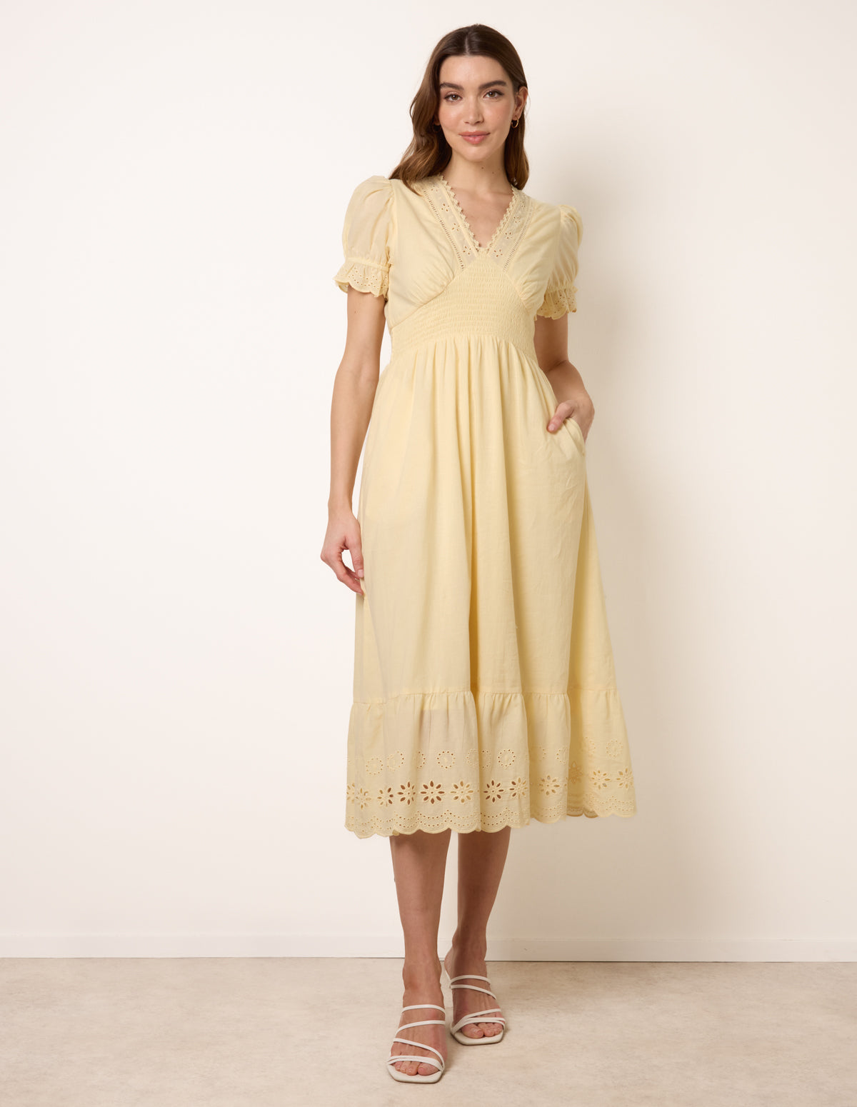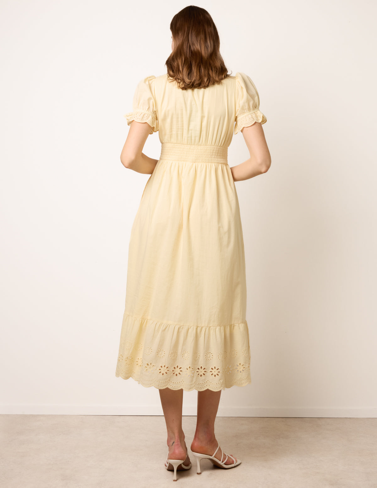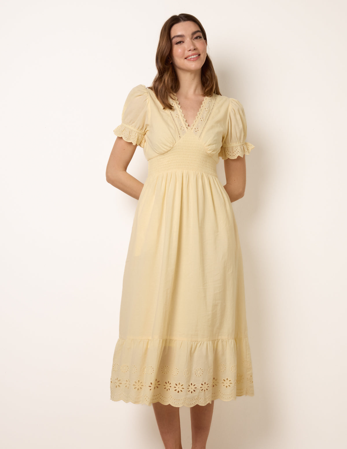 This elegant dress combines carefree charm with thoughtful details, making it a perfect addition to your warm-weather wardrobe. The embroidered panels and ruffle create a beautifully balanced look, perfect for all occasions this season. Team with gold sandals and gold accessories to finish off the look.