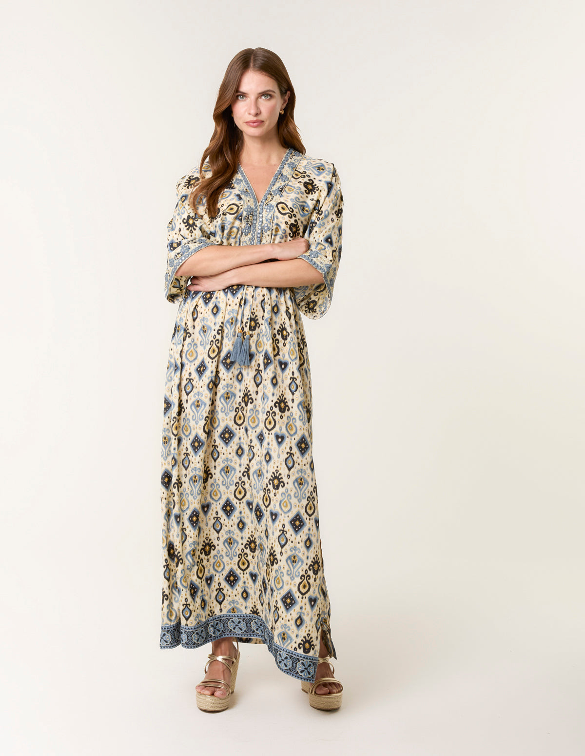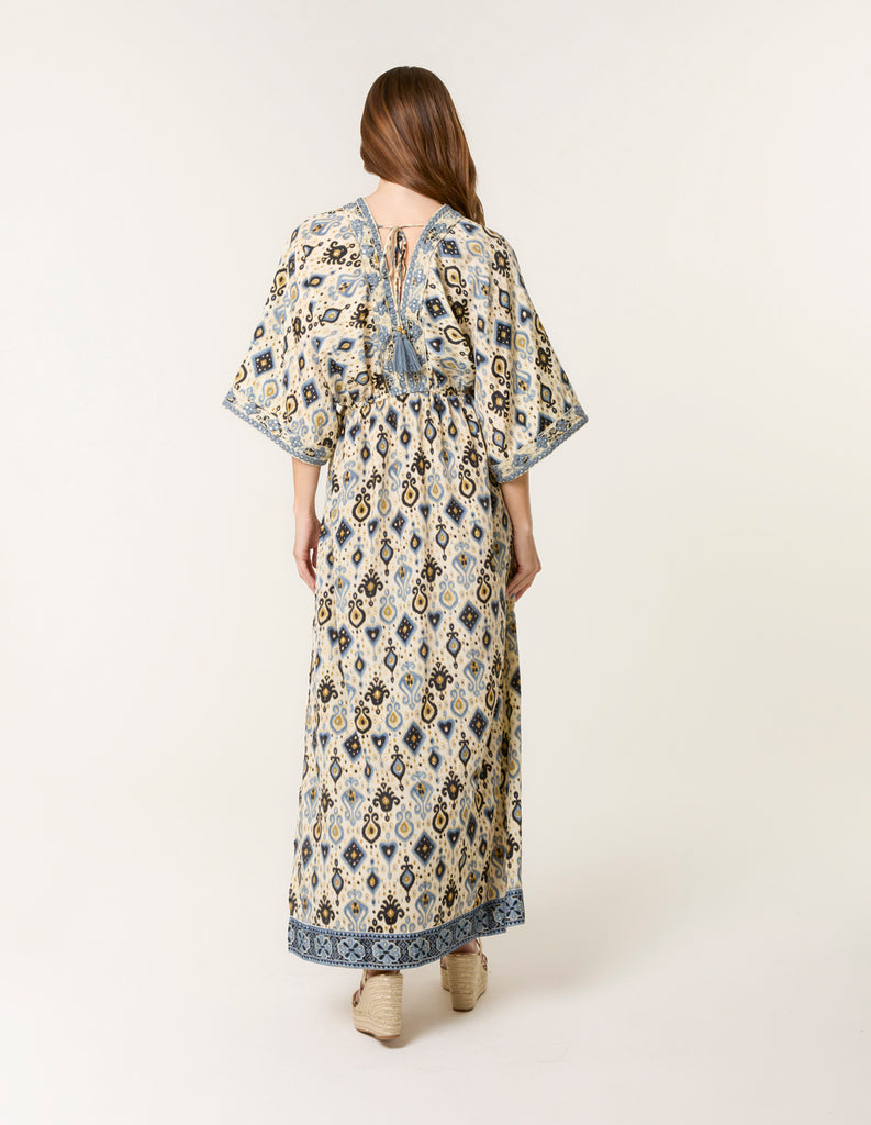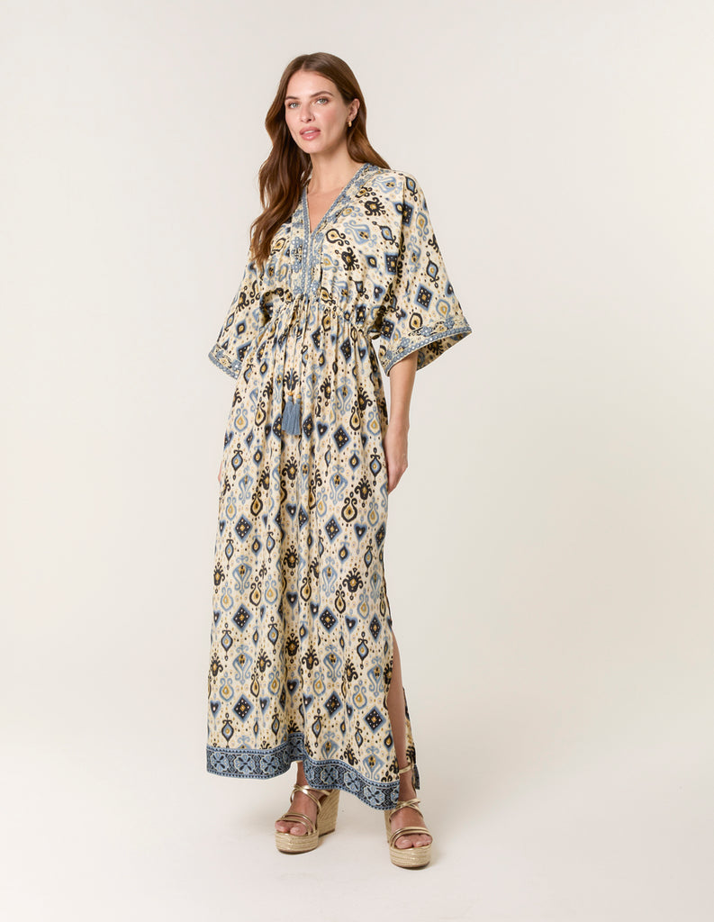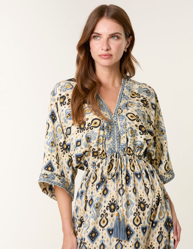 A kimono style maxi dress perfect to pack for your next summer holiday. Tassels, embellishment and abstract prints this dress really does have it all!